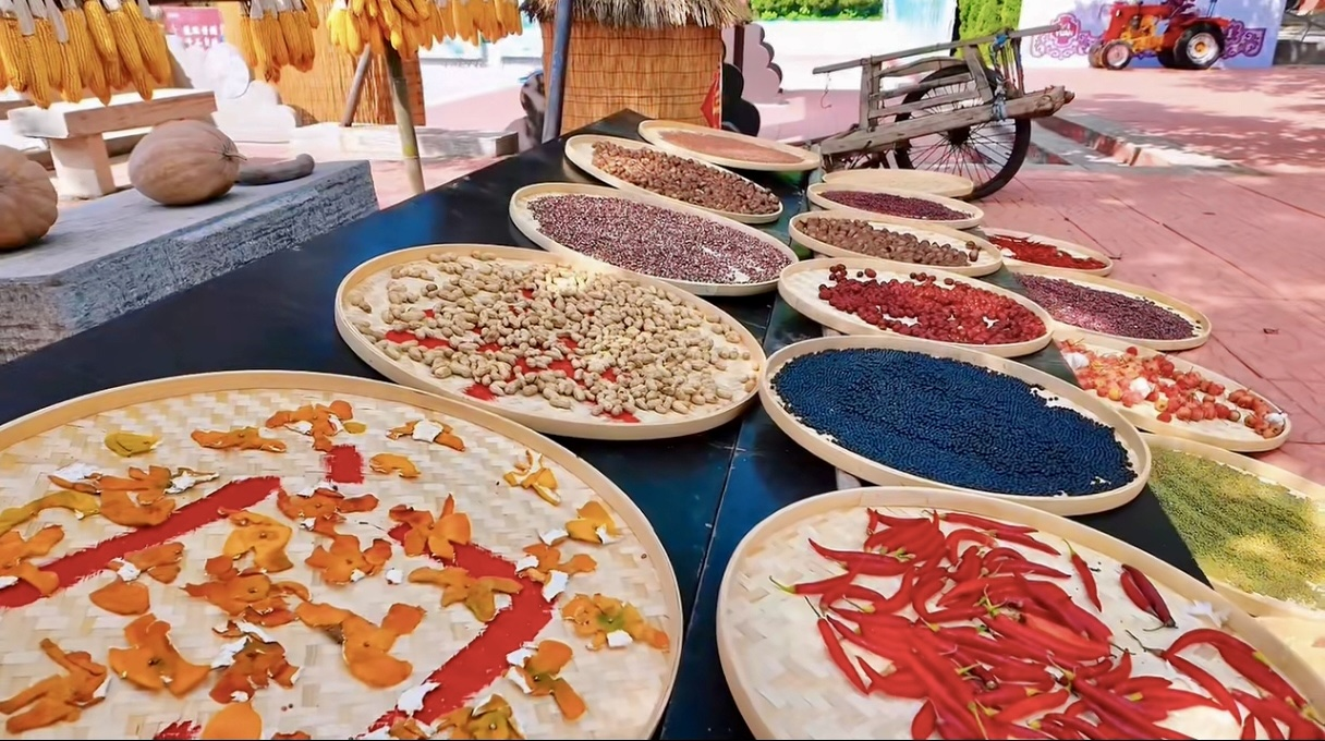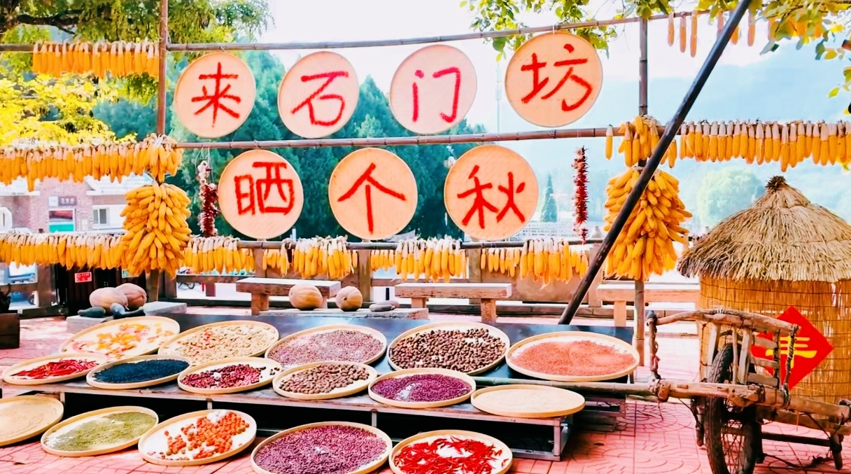 秋日的石門坊,一場與眾不同的“豐收美學(xué)”正在上演。百年核桃樹下,玉米、辣椒、谷物拼組成巨大的豐收圖騰;東方紅拖拉機(jī)、小推車、懷舊唱片機(jī)重現(xiàn)8090年代潮流場景——這不是傳統(tǒng)的民俗節(jié)慶,而是一場融合農(nóng)耕文化與現(xiàn)代創(chuàng)意的“新農(nóng)潮”盛宴。