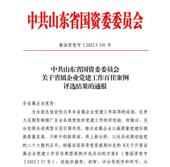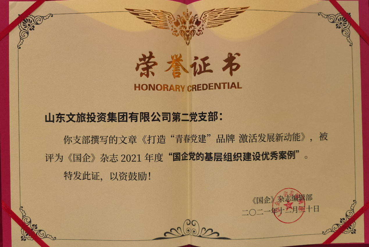 同時(shí),在近期省國(guó)資委黨委舉辦的“以高質(zhì)量黨建引領(lǐng)省屬企業(yè)高質(zhì)量發(fā)展”推進(jìn)會(huì)上,山東文旅集團(tuán)所屬山東文旅投資集團(tuán)有限公司第二黨支部被頒發(fā)“國(guó)企黨的基層組織建設(shè)優(yōu)秀案例”榮譽(yù)證書。