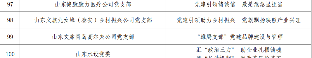 為全面總結(jié)宣傳近年來(lái)省屬企業(yè)黨建工作取得的成就,根據(jù)省國(guó)資委黨委前期印發(fā)的《關(guān)于開(kāi)展省屬企業(yè)黨建工作百佳案例評(píng)選活動(dòng)的方案》,經(jīng)組織推薦、初審、評(píng)分等程序和環(huán)節(jié),從445個(gè)推薦案例中最終評(píng)出100個(gè)典型案例。其中,由山東文旅集團(tuán)黨委選送的九女峰(泰安)鄉(xiāng)村振興公司黨支部《黨建引領(lǐng)助力鄉(xiāng)村振興 黨旗飄揚(yáng)映照產(chǎn)業(yè)興旺》和青島高爾夫公司黨支部《“雄鷹支部”黨建品牌建設(shè)與管理》案例獲評(píng)“省屬企業(yè)黨建工作百佳案例”。